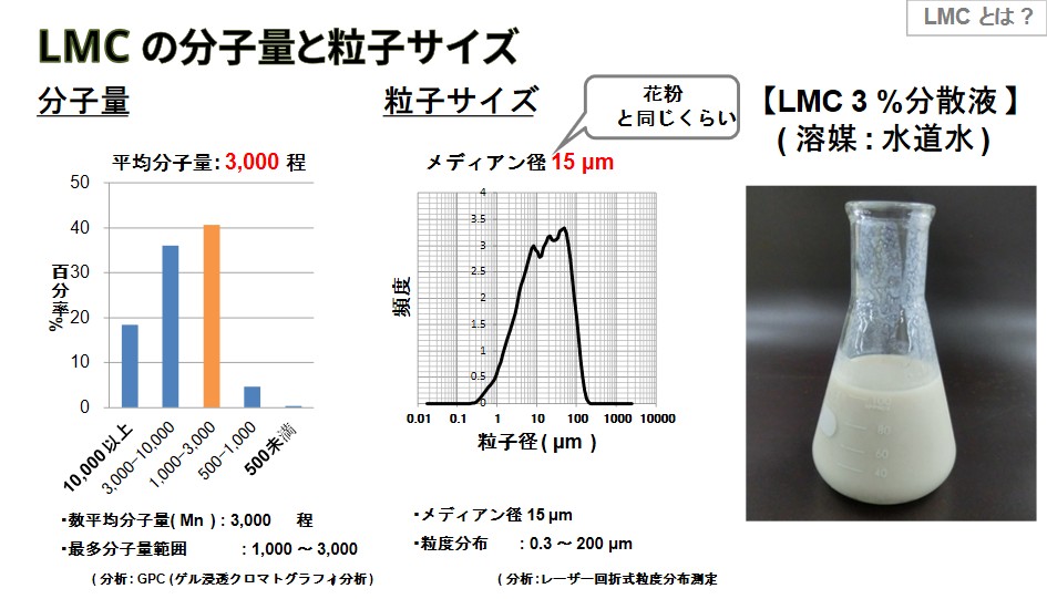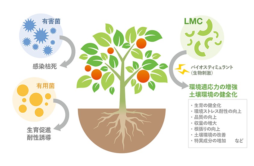 LMCはキチン断片と同じ構造のため、植物へ接触させると外敵の襲来と勘違いし、植物が本来備え持つ生物的・非生物的ストレスへの防御に係る反応が誘導されると考えられています。