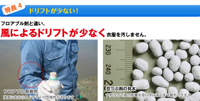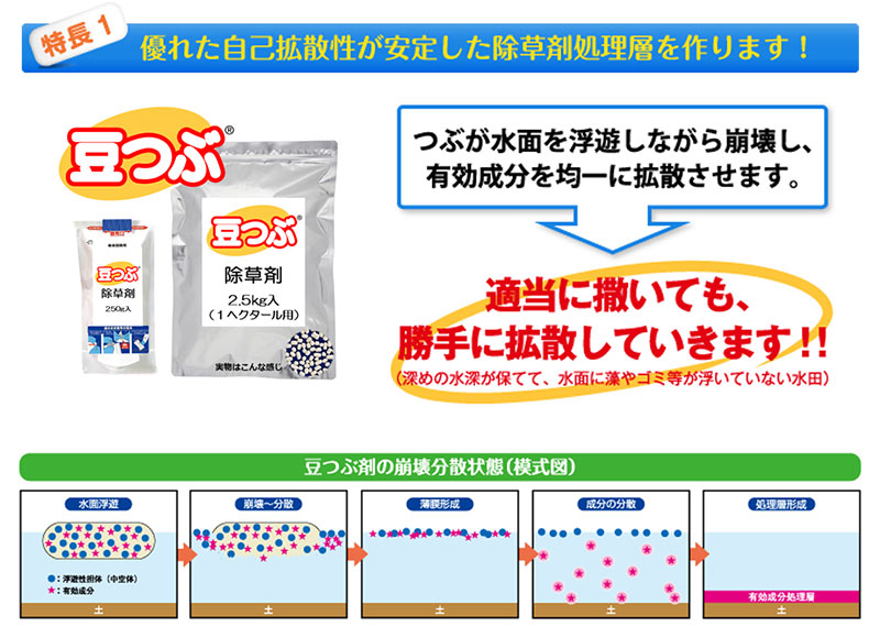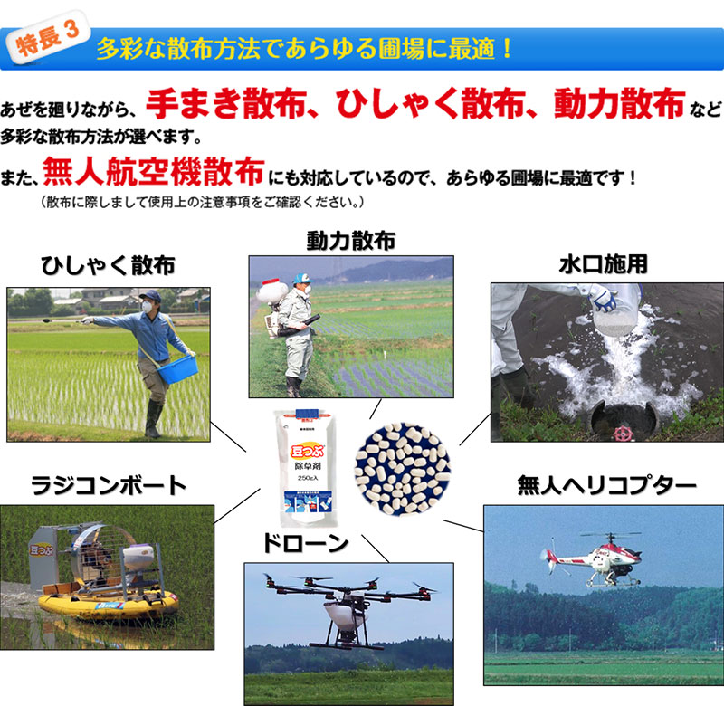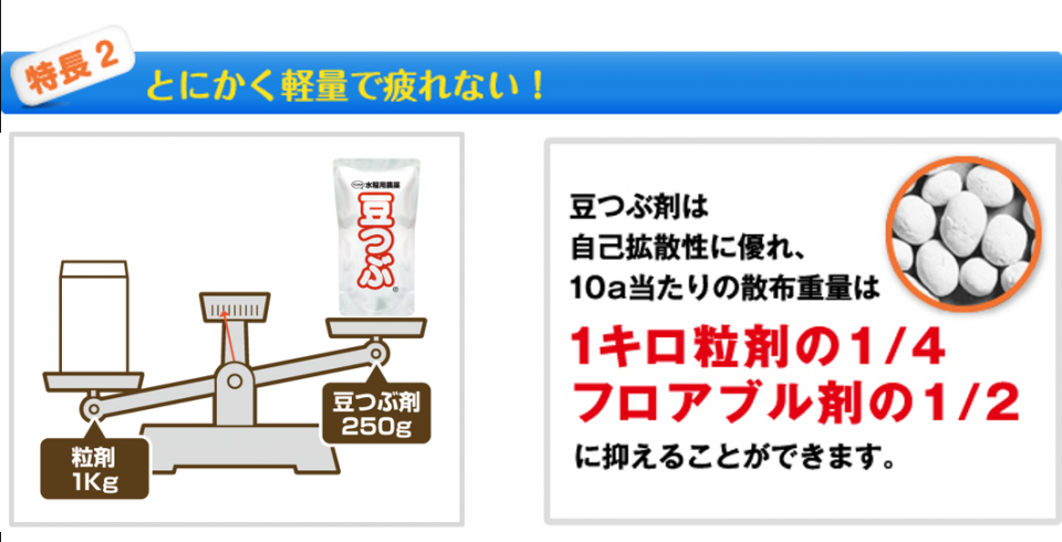 「豆つぶ®剤」は除草剤から始まり、今では本田のウンカ類・ カメムシ類対策の殺虫剤、いもち病や紋枯れ病対策の殺菌剤も加わり、10万ヘクタールを超える水田で使われています。大規模経営での労力軽減など経営改善にも貢献。優れた自己拡散性で、水に浮かび水面を泳ぎながら圃場全体に広がります。10アールあたり250グラムと軽量で疲れず、散布作業を省力化。手まき、動力散布機、ドローンなど場面に合わせた散布方法を選択できます。