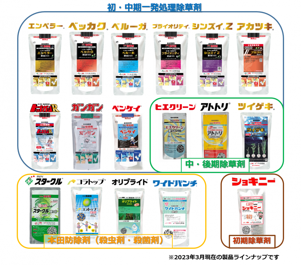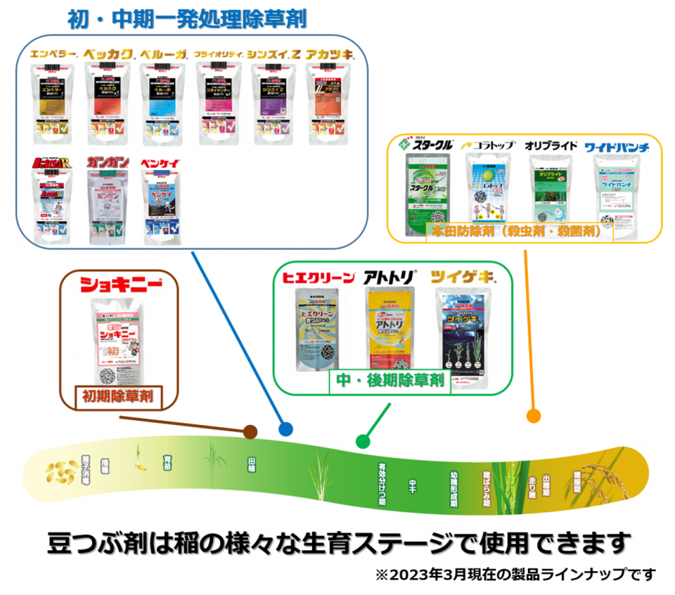 除草剤からスタートした「豆つぶ®剤」ですが、今では本田のウンカ類・ カメムシ類対策の殺虫剤や、いもち病、紋枯れ病対策の殺菌剤も加わり、発売から20年を経て10万ヘクタールを超える水田で使われています。その中でも大規模経営をされている法人様からは「労力が軽減できる」と、経営改善にも貢献できる剤型として支持を頂いています。