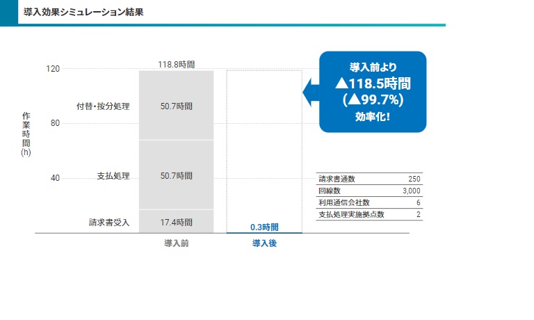 茨城県稲敷市下水道課では、法人“ビリングONE”による業務時間の削減で効果を発揮しています。毎月35通の納付書の開封作業が一切なくなりました。さらに各通信費の勘定項目を事前に指定し、それをCSV形式でダウンロードできるため、従来は手作業していた仕分け、入力作業も不要になりました。成果のデータを算出した結果、毎月約14時間を要していた経理処理が52分と、約94%も短縮されたという試算が出ています。