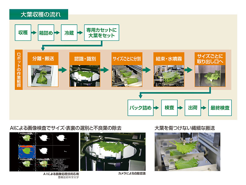 内職依存で複雑な生産工程の大葉を、分別から結束までをロボットで自動化することで、大葉の鮮度向上と農家の皆様の負担軽減に貢献。AIによる画像検査によるサイズ・表裏の選別や不良葉の選別除去、大葉を傷つけない繊細な搬送が、高品質な大葉の出荷をサポートします。
