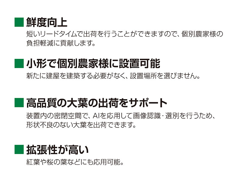 製品の詳細は[url=https://www.sinfo-t.jp/agriculture/large-leaf-harvest.html]当社Webサイト[/url]でもご確認いただけます。
