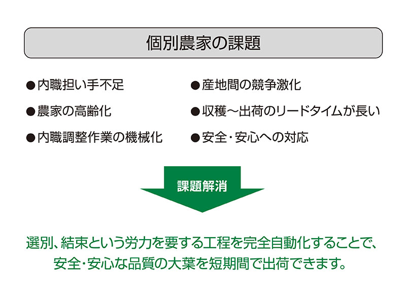 選別から結束まで、大葉の収穫作業をサポートするロボット。安全・安心な品質の大葉を短期間で出荷できます。