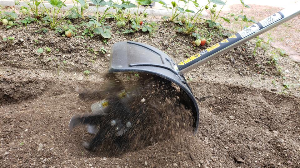 最大の特徴は、独自設計の高減速ギヤによって実現した低回転での高トルク。中耕・攪拌・除草・畝立をパワフルにこなすことができる製品です。土を細かく柔らかくほぐし、石灰や肥料をムラなく攪拌できるよう、爪の形状にも工夫しました。ピンを外すだけで簡単に爪を取り外せるので、メンテナンスもスムーズです。