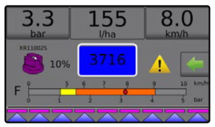 目標散布量を設定するだけで、独自のVisiFlo®ディスプレイが、適したTeeJetノズルチップを選択表示。散布が始まると、散布量、トータル散布量、圧力、スプレーヤー速度、散布面積をディスプレイに表示。