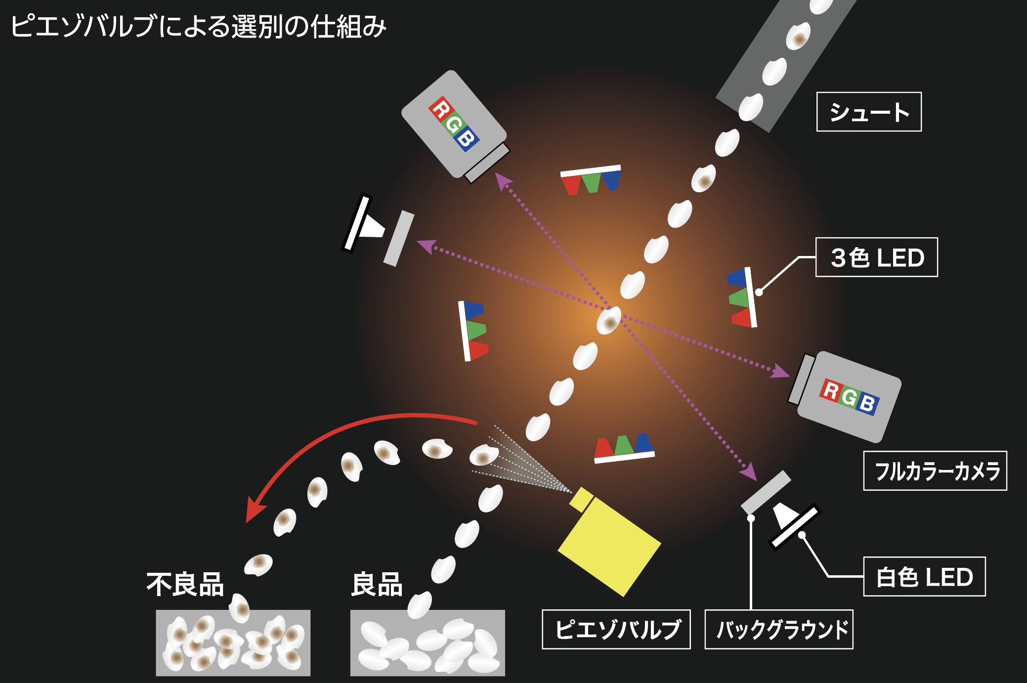 光学部に新たに採用した4色LEDとフルカラーカメラから得た原料の多量な情報を、サタケ独自の画像処理技術(特許第6152845号)により、最適に判別。青未熟・乳白・しらたの選別能力が向上しました。