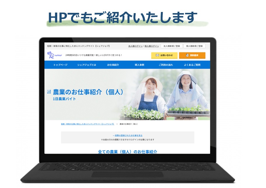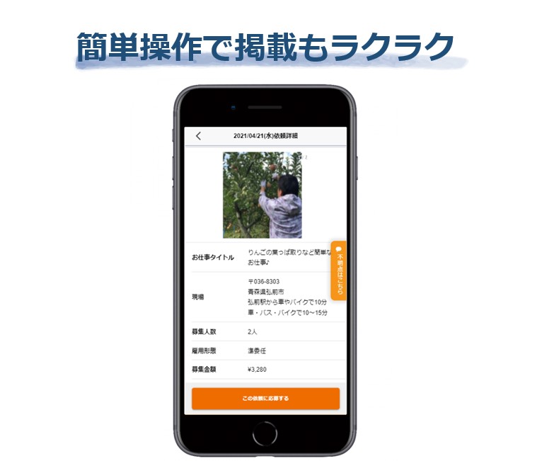 ワンクリックで求人掲載ができ、電話一本でも、登録~掲載まで完了が可能です。収穫時期・台風が来る前の準備・短期間で作業を終えなければならないとき、慢性的な人材不足にぜひご活用ください。