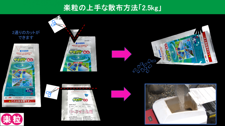 楽粒は北興化学工業株式会社の独自製剤技術の拡散型製剤です。田んぼの大小を問わず、中に入らずに散布 ができます。様々な処理方法にも対応しています。