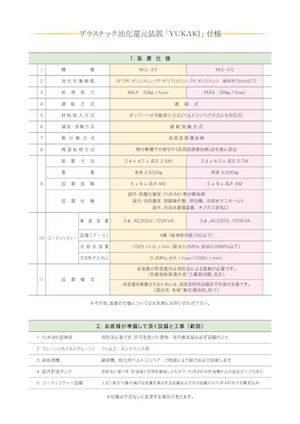 廃プラスチックを燃料に換える優れもの。プラスチックのPP(ポリプロピレン)・PE(ポリエチレン)・PS(ポリスチレン)を高周波により溶解・気化・分留化し、重油相当の油に還元することができる。バーナー式ではなく高周波誘導加熱式のため安全性が高い。MS-30は30kg、MS-50は50㎏をそれぞれ1時間で処理する。特許取得済み。