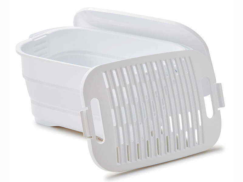 つけ置き洗いの悩みを解決! 作業着や靴を洗濯前に予洗いできる便利アイテム。従来品より容量が大きく、水抜き栓つきで持ち運びもラクに。付属の洗濯板は“落とし蓋”としても機能し、靴が浮いて汚れが落ちにくいという課題を解消。さらに、“乾かす工夫”も施され、穴が開いているため自然に水切りができる。使用後はたたんでコンパクトに収納可能。
