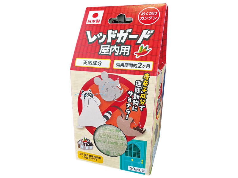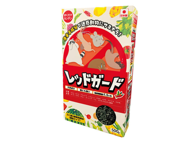 「レッドガード」や「ピリピリスティック」は、環境への配慮が詰まった商品。例えば「まくだけ簡単 レッドガード」には、自然由来の素材である天然ゼオライト、唐辛子エキス、バイオマス由来樹脂が使われている。畑に撒くと、やがて分解されて土に還るため、環境に負荷がかからない。また、本品には高い忌避効果が期待できる。