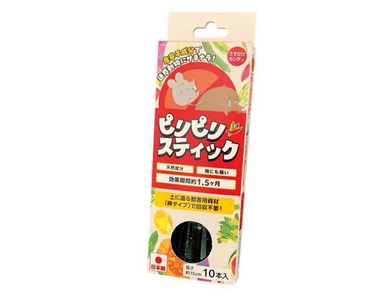 ネズミやモグラなど土中に潜む動物の忌避におすすめ。濃縮された唐辛子エキスが配合されており、動物の味覚と嗅覚を強烈に刺激。スティックは土に還るため、回収不要。