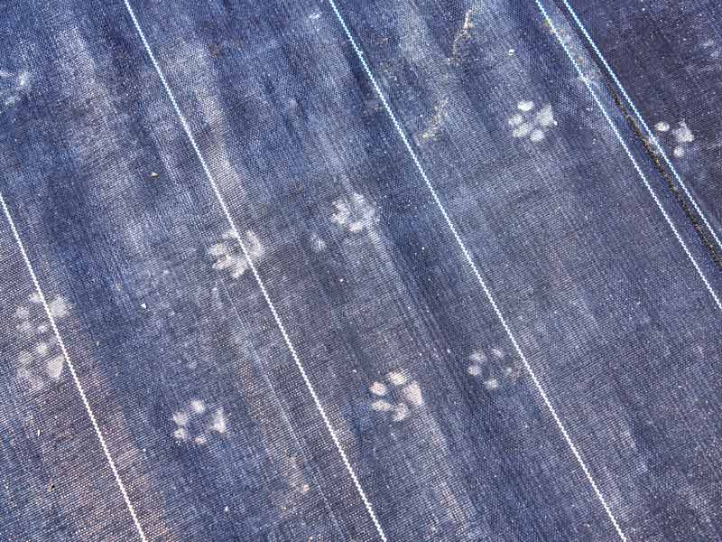 圃場のシートの上には、レッドガードやピリピリスティックを使用する前についた、狸の足跡が。製品を利用し始めてから被害は減った。