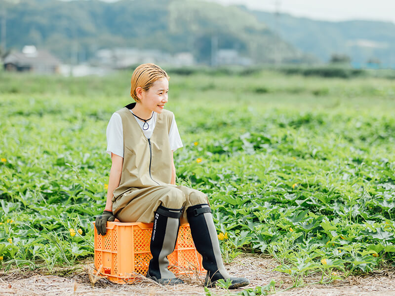 岡山県瀬戸内市牛窓町で農業を営むナナノウエンが立ち上げた「BLESSING」。夫婦で就農し、今年で10年目を迎える。洋服好きの川本優菜さんは、「農業を楽しみながらオシャレも楽しみたい」と理想の作業服を求め制作をスタート。頭に思い浮かべたアイデアをパタンナーと形にし、二人三脚で新しい農作業服を試作している。農園では秋冬春にキャベツと白菜、夏は冬瓜とそうめん南瓜・かぼちゃをつくっているとのこと。