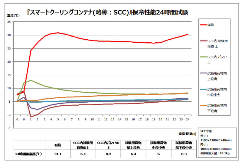 気になる保冷効果は、ご覧の通り! なんと環境(気温)が30度であっても、コンテナ内の温度は24時間、7度以下に収まっている。十分過ぎる保冷性能を有していることが分かる。