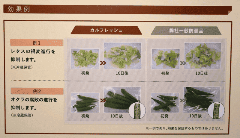「カルフレッシュ」は青果物の包装のほか、お弁当用の抗菌シート(お弁当の上に載っている透明フィルム)にも使われている、とのこと。