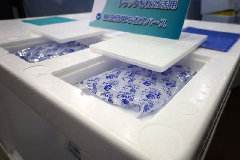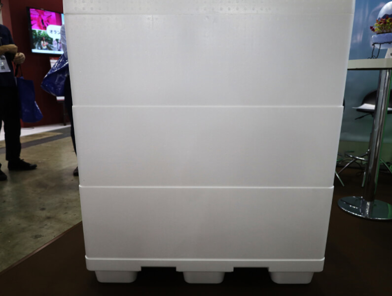 そこに利用できそうな製品を展示していたのが、大阪に本社を置く、発泡スチロール成型品製造及び販売を主業とするトーホー工業。発泡スチロール製の大型コンテナ「EPSスマートクーリングコンテナ」を展示していた。