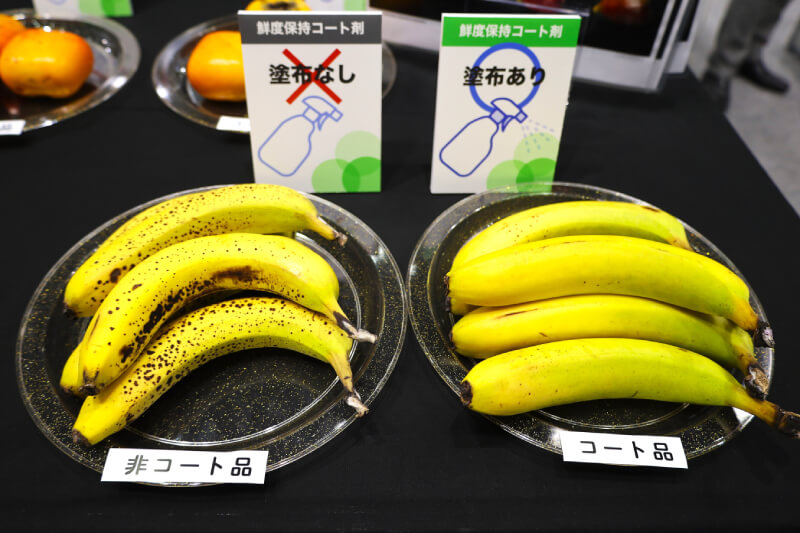 展示ブースには、サンプルとして「鮮度保持コート剤」塗布有無の、ピーマン、ミニトマト、バナナなどが展示されていた。リーフレットでは、和梨(幸水)、すだち、ぶどう(巨峰)、メロン、さくらんぼ(佐藤錦)、柿(中谷早生)への適用事例が示されていた。葉物への適用は難しい。