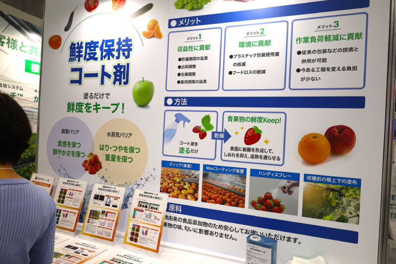 収穫後の青果物の鮮度保持に役立つ製品が、いよいよ発売されそうだ。三菱ケミカルが展示していた「鮮度保持コート剤」が、それだ。昨年の農業WEEKでも展示していたので、ご存知の方も少なくないはずだ。同社フード・ヘルスケアインキュベーション部の小池泰介さんに聞いた。