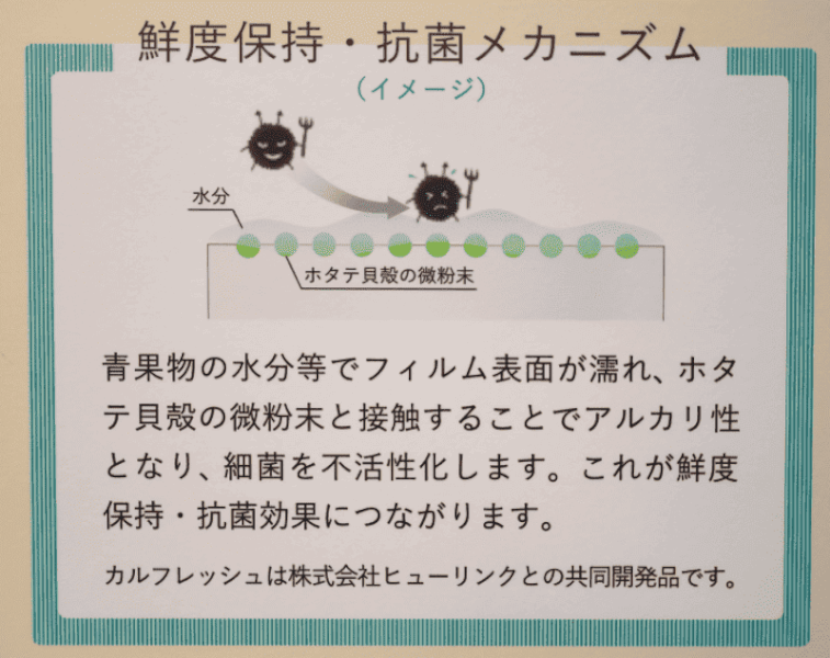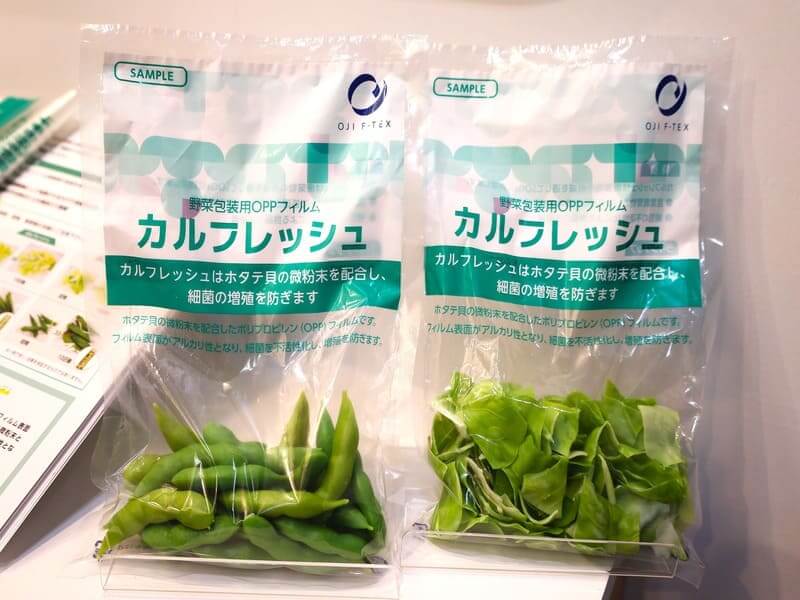 王子エフテックスが展示していた「カルフレッシュ」は、抗菌フィルムの1種だ。抗菌機能を果たすのは、廃棄物として捨てられていたホタテ貝殻。これを材料として使用するから、廃棄物ロスと、青果物の鮮度維持により食品ロスの低減を両立する、というわけだ。
