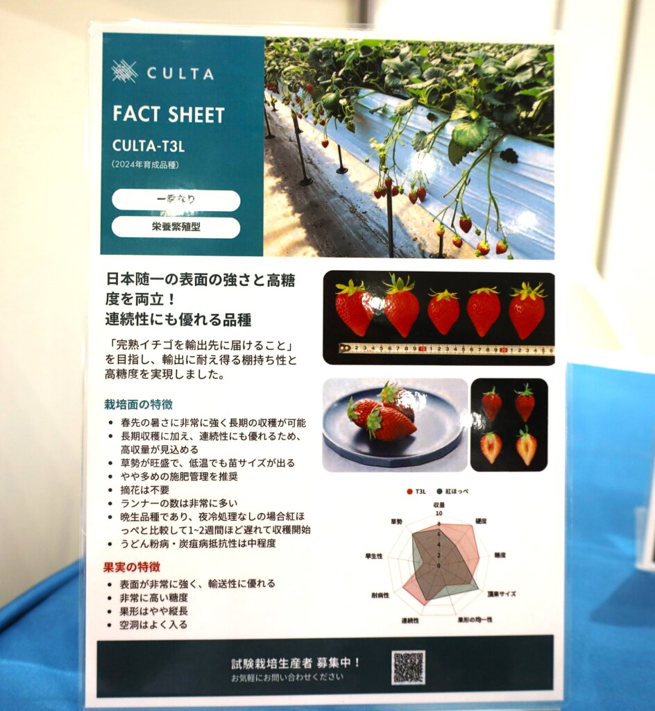 近年、日本産イチゴの海外輸出は増えているが、品種名ではなく棚持ち性の高さを含めた品質で勝負する、という売り方が「CULTA-T3L」ならば成立するのだろう。