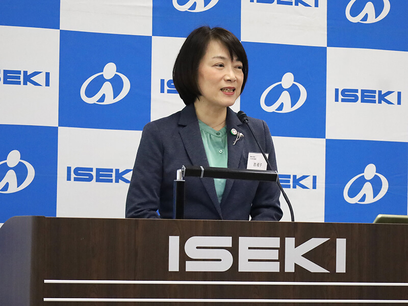 農水省で「みどり戦略」を担当する大臣官房審議官の西経子さんが登壇し、「井関農機の創業の精神が、人口減少や気候変動という令和の課題のなかで、改めて意味を持ってきている。生産性向上と環境負荷低減の両立は、緑の食料システム戦略の中核だ。スマート農業や草刈りロボット、鳥獣害対策は、地域の稼ぐ力を高める重要な技術である。同行した若手職員にとって、このようなイノベーションの現場を体験するのは貴重な機会となる」と話した。