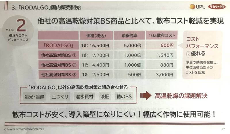 過去に当サイトでも紹介したように、2024年6月6日、同社とアリスタライフサイエンスは、バイオスティミュラント分野で協業すると同時に、協業第1弾のBS資材として「ギャクシー」を発売した。「ロダルゴ」は両社の協業第2弾のBS資材となる。