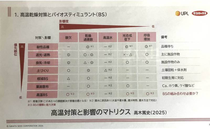 高温対策BSは正しく使うことで優れた効果を発揮するが、農業生産現場で実施できる高温対策の優先順位として、決して最上位に置くべきものではない。高温耐性品種の採用、遮光・遮熱資材の利用、換気や冷却の実施、そして基本中の基本である土づくり……それら対策を実施したうえで高温対策BSを使うべきだ、と暗示している。
