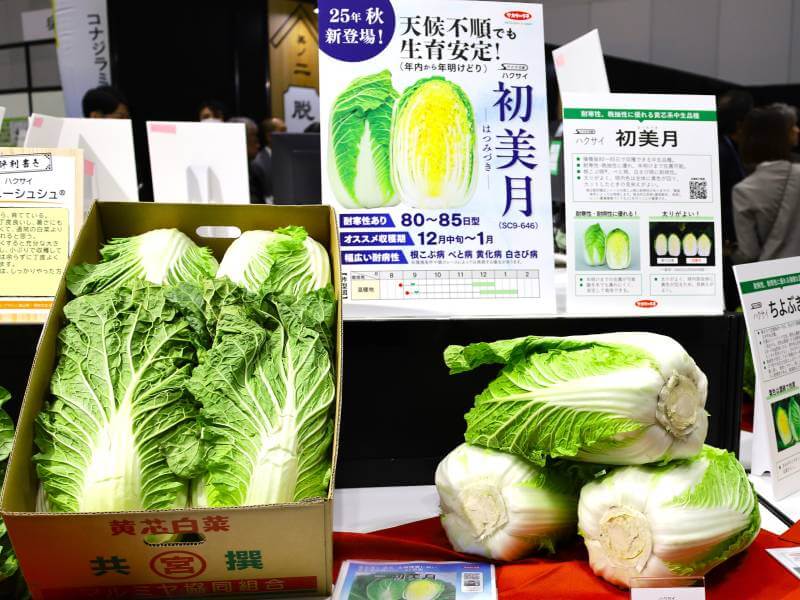 ハクサイ「初美月」(はつみづき)は2025年7月に発売された新品種。耐寒性・在圃性・耐病性に優れ、暖冬でも安定した出荷が可能。べと病・根こぶ病・黄化病・白さび病に耐病性を有する、年内から年明けに収穫が可能な80-85日型の中生品種だ。