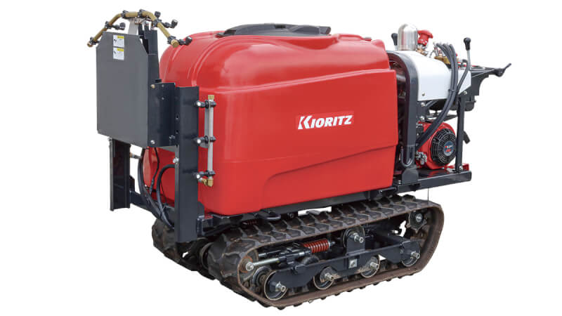 散布の根幹を担うポンプには、耐摩耗性に優れた共立セラミック動噴を搭載している。また、クローラの採用により、ぬかるみやすい園地でも安定した走行性を発揮する。