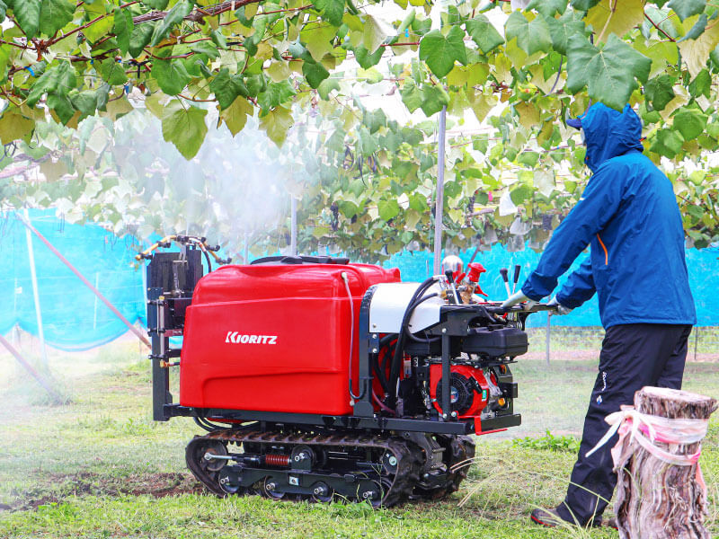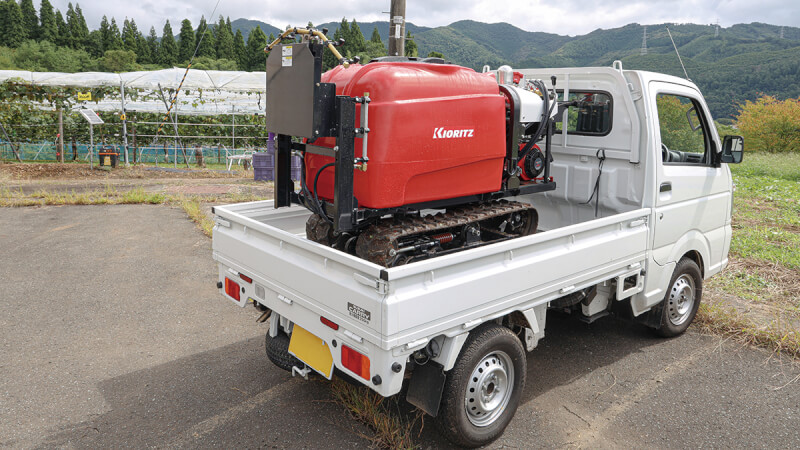 棚作果樹や果菜類の立体栽培では、枝葉が広がるため薬液を均一に付着させるのが難しく、防除作業は手間がかかる。大規模圃場ではSSの利用が一般的だが、小規模圃場では「高額で大型のスピードスプレーヤを導入するほどではない」と考える方も多く、手散布で対応しているケースが少なくない。しかし、手散布は作業者への負担が大きく、多くの作業時間を要してしまうのが現状だ。