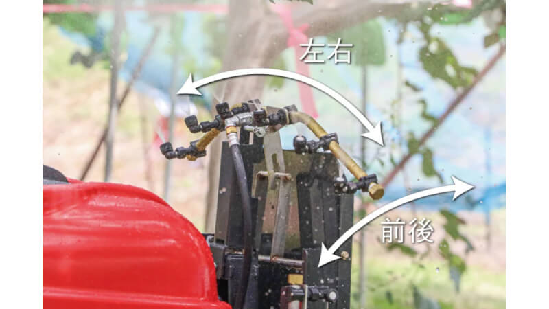 最大の特長は、ノズルがスイングしながら散布する構造だ。ノズルが揺れ動きながら薬剤を散布することで、枝葉が軽く揺れ動く。これにより葉裏や枝の奥まで薬液が入り込みやすくなる。こうして熟練者の手散布に負けない均一な防除を実現する。
