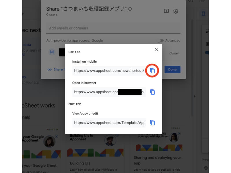 Share linksをクリックいただくとさらにポップアップが表示されますので、Install on mobileのURLをコピーしてスマホで開くと作成したアプリが表示されます。