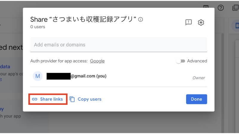 ここで、アプリを使いたい方のメールアドレス(無料だと3名まで)を入力しても共有できますが、僕はもっと簡単に使えるShare linksの機能を使っています。