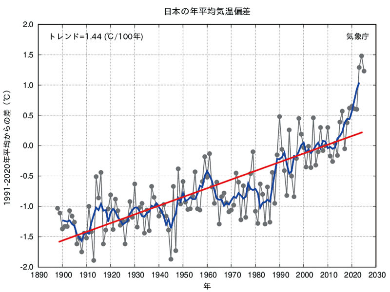 2025年の日本の平均気温の基準値(1991~2020年の30年平均値)からの偏差は+1.23℃。これは1898年の統計開始以降、3番目の高温でした。