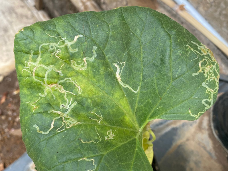 体長2㎜ほどの黒いハエの幼虫(ウジムシ)が、葉の組織内に侵入してトンネルを掘るように食害します。葉にくねくねとした白い筋ができるのでエカキムシ(絵描虫)ともいいます。幼虫は筋の先端にいるので指でつぶします。被害葉は切りとり持ち出し処分します。発生が少ない場合は実害はないので放任してもかまいません。