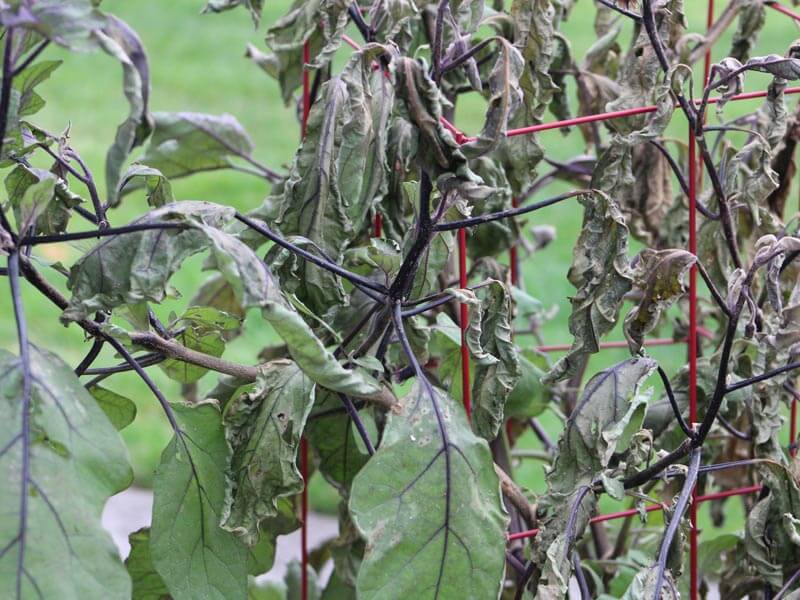 夏に茎葉が青い(緑の)まま急にしおれて枯死します。細菌による土壌伝染病で、過湿になると多発するので、水はけをよくします。30℃以上の高温でも多発するので、敷きわらをして地温の上昇を抑えます。ナスだけでなく、トマトやジャガイモなどのナス科野菜の連作は避けます。