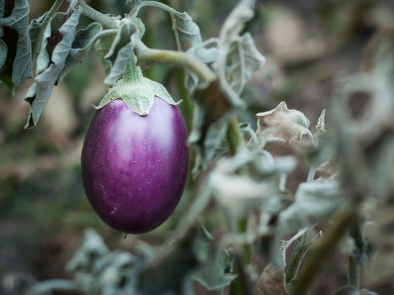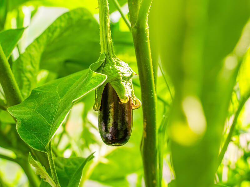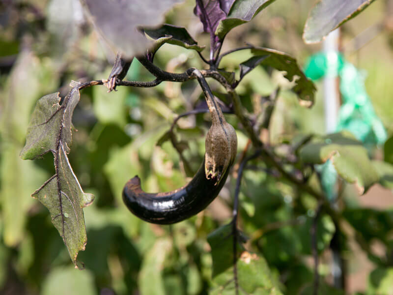 ナスの紫色の色素はナスニンというアントシアン系色素で、強い光に当たることで着色します。葉が茂りすぎて中まで光が当たらないと、白いナスが出現することがあります。果実に袋をかぶせて育てると白いナスになります。葉や枝が混んできたら、早めに摘葉や整枝をします。