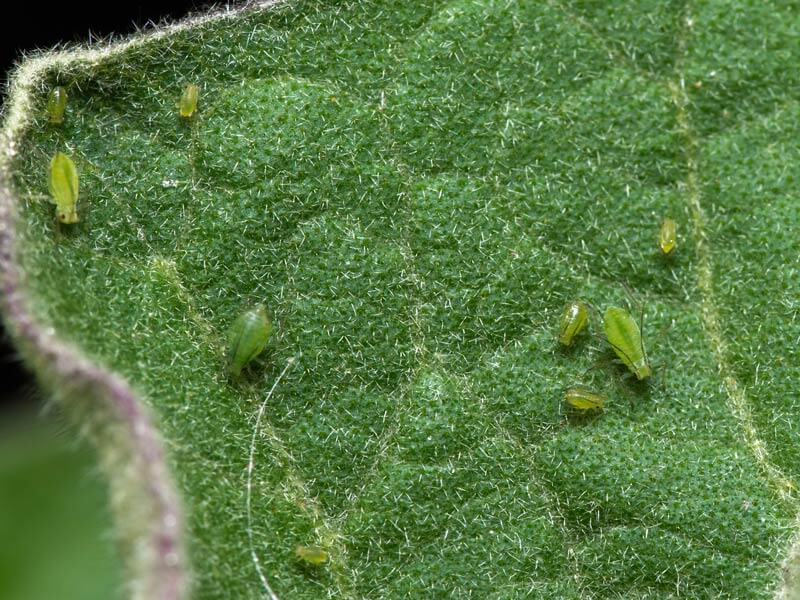 葉に体長約1mmの小さな虫が群生し、吸汁して生育を阻害します。モザイク病(ウイルス病)の原因となるウイルスを媒介します。窒素過多だと葉でアミノ酸が多く合成され、それを好むので多発します。キラキラ光るものを嫌う習性があるので、シルバーマルチを張ると飛来防止効果があります。見つけ次第捕殺します。