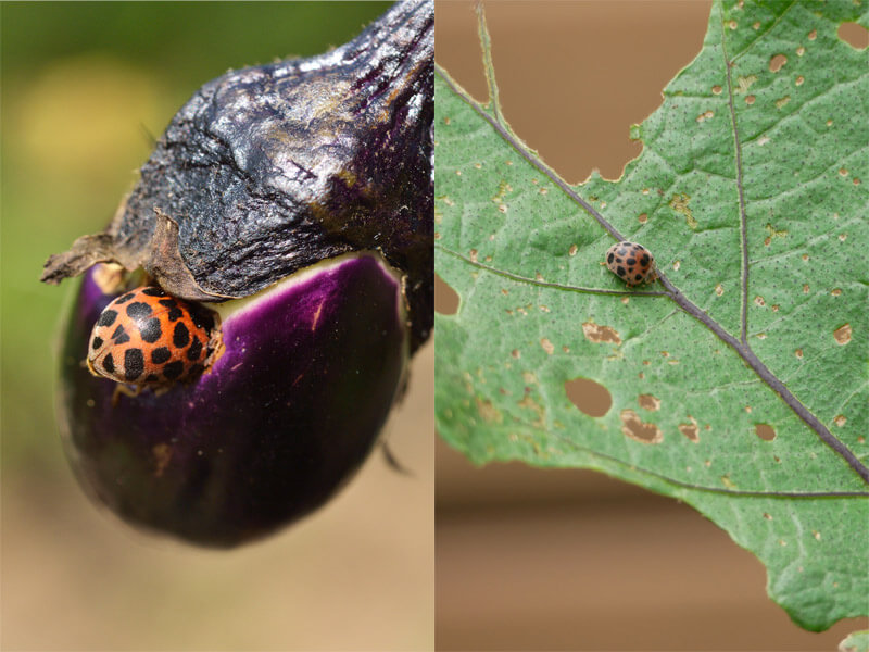 星が7つのナナツボシテントウムシはアブラムシを食べてくれる益虫です。テントウムシに似ている星が28あるニジュウヤホシテントウテントウは幼虫も成虫も葉を食害します。見つけ次第捕殺します。葉裏に卵が産みつけられていたら、葉を切りとり持ち出し処分します。