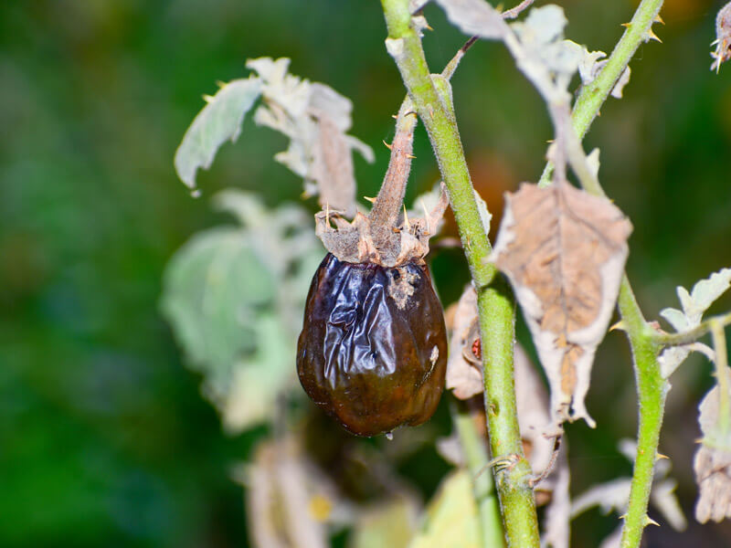 葉に不整形で灰緑色の病斑が生じ、徐々に大きくなり暗緑色の大型病斑になります。病斑の周りや葉裏には霜状のカビが生えます。果実に伝染すると暗褐色の火傷状の病斑を生じます。土壌が過湿になると多発するので、水はけをよくします。糸状菌(カビ)による病害で蔓延力が強く、泥跳ねで菌が茎葉や果実に侵入するので、マルチを張って泥跳ねを防ぎます。ナスだけでなく、トマトやジャガイモなどのナス科野菜の連作は避けます。