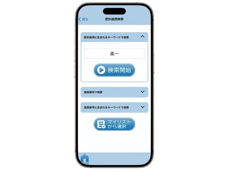 肥料の入力欄にある「肥料を選択」ボタンをタップすると、キーワードや登録番号で肥料を探せる検索欄が表示される。キーワードもしくは登録番号を入力すると、使用する肥料がヒットし、その成分含有率が計算に利用される。