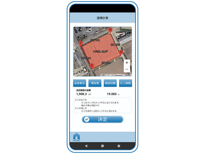 地図データ上で、圃場の部分を囲むかたちでピンを立てると、圃場の面積が算出される。