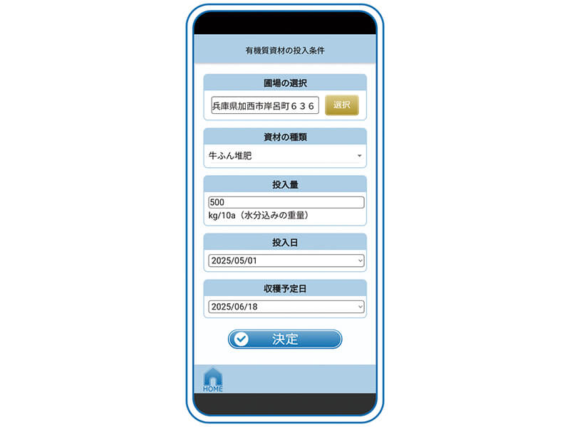 アプリ上の「有機質資材を選択」ボタンをタップし、投入した堆肥の種類や投入量などを入力。圃場の位置を選択することで、その圃場の土壌中温度、水分が設定される。これらのデータから肥効量が計算される。