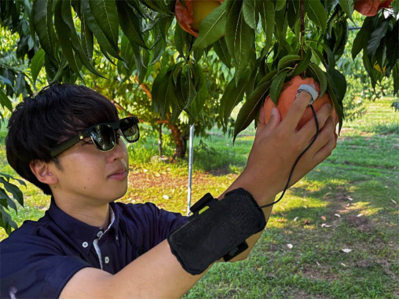 「モモとろう」は、指輪型のセンサーを指先に付け、袋かけされたままの桃に触れることで熟れ具合を測定する。その測定結果からはじき出される収穫までの日数がスマートグラスに表示される。
