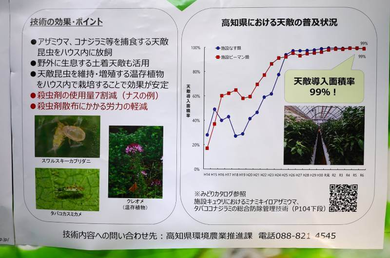 高知県では、生産者が粘り強く試行錯誤を重ね、地域全体で知見を共有した結果、現在では施設ナス・施設ピーマンにおける天敵導入面積率99%を達成している。地域で取り組んだ結果、農業生産者間での情報共有だけでなく、天敵そのものの融通も行われるようになった。パネルでは記されていないが、この生産者同士の助け合いが成立している点こそが、高知IPMの最大の強みであると思われる。