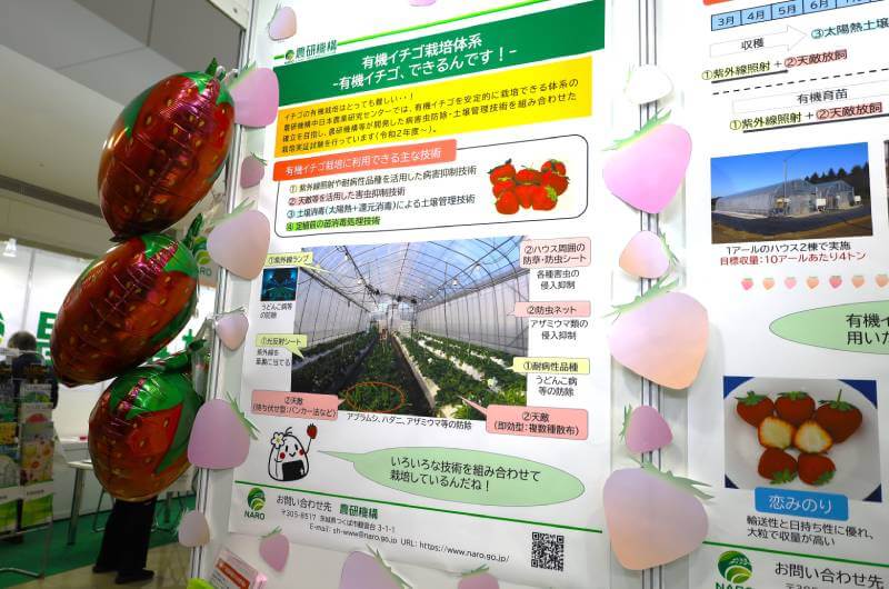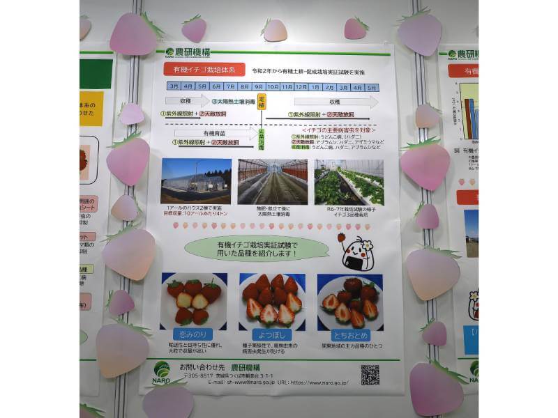 農研機構が展示していた「有機イチゴ栽培体系」も、IPMの実装段階を象徴する取り組みだ。有機イチゴ栽培体系の確立とは、言い換えれば「イチゴIPM栽培のマニュアル化」に他ならない。