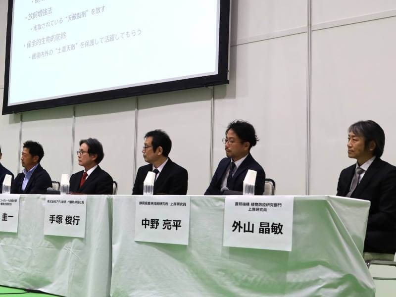 天敵の供給側からは、アグリ総研代表取締役社長の手塚俊行さんが登壇。国産天敵・在来天敵の商品化に取り組む現状を紹介した。研究と現場、そして事業としての成立をつなぐ役割の重要性が示された。
