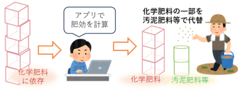 参考:(お知らせ) 下水汚泥資源をリサイクルした肥料等から供給される養分量を見える化し、化学肥料の適正施用をサポートする「汚泥肥料、菌体りん酸肥料の肥効見える化アプリ」(畑地版)の公開