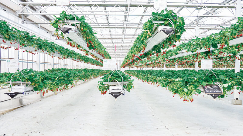 上下式ハンギングガターが観光農園を非日常的空間にする。通路は1.5mで、車椅子や妊婦の方もいちご狩りを体験できる。白を基調に設計された近未来的な園内も必見だ。